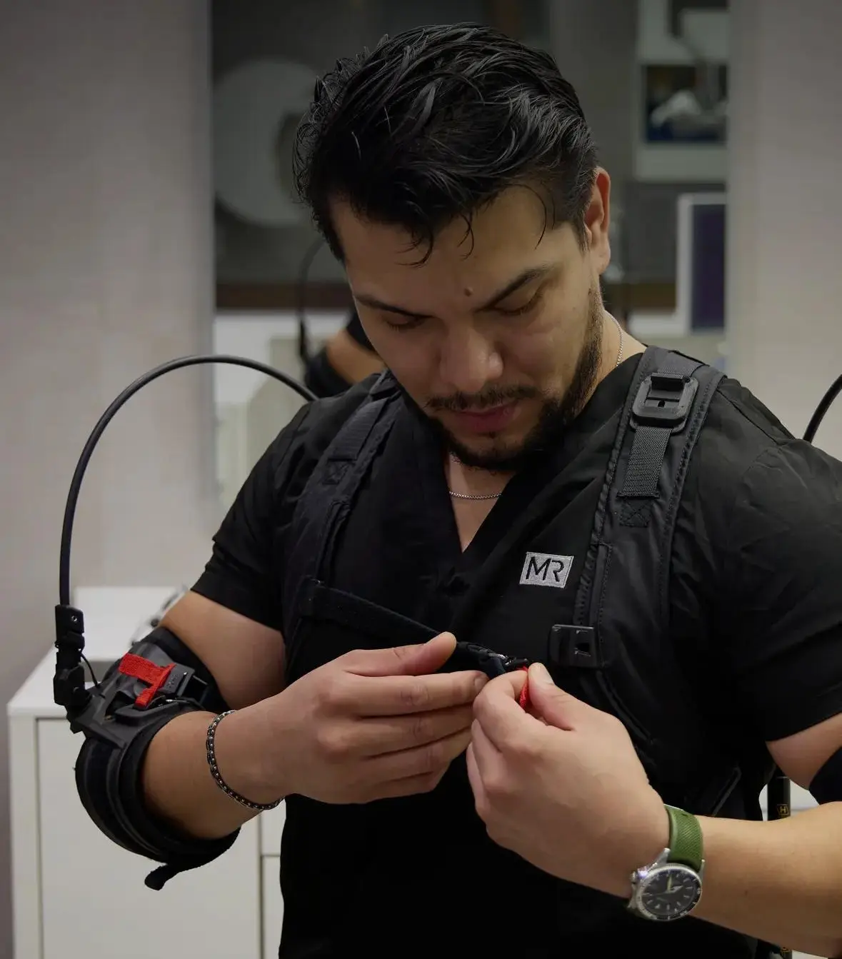 Eksoskelettet fungerer som en diskret støtte, der hjælper med at opretholde en mere komfortabel holdning. Det bidrager til forebyggelse af spændinger, samtidig med at det respekterer de fine bevægelser, der er nødvendige for tandpleje.
